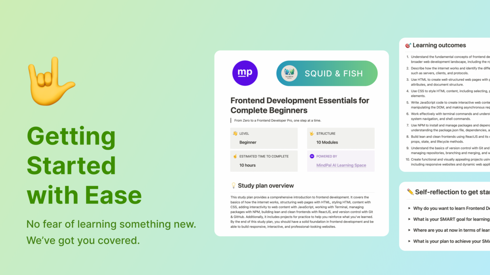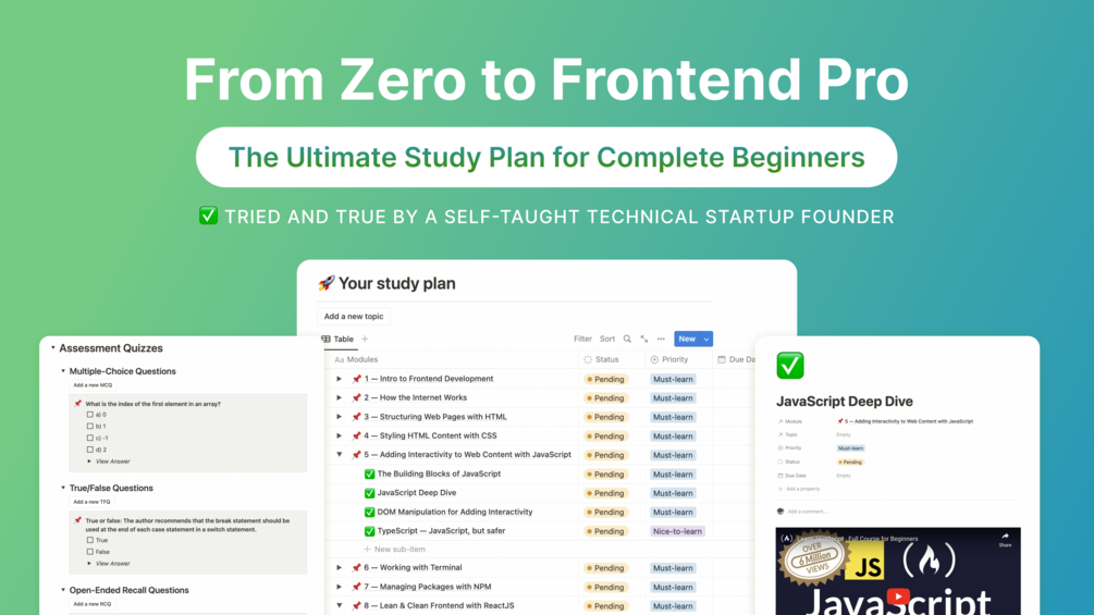 Our study plan is perfect for anyone looking to get started with frontend development or wanting to enhance their existing skills. Whether you're looking to start a career in web development, build your own website or application, or simply improve your knowledge, our study plan has got you covered.