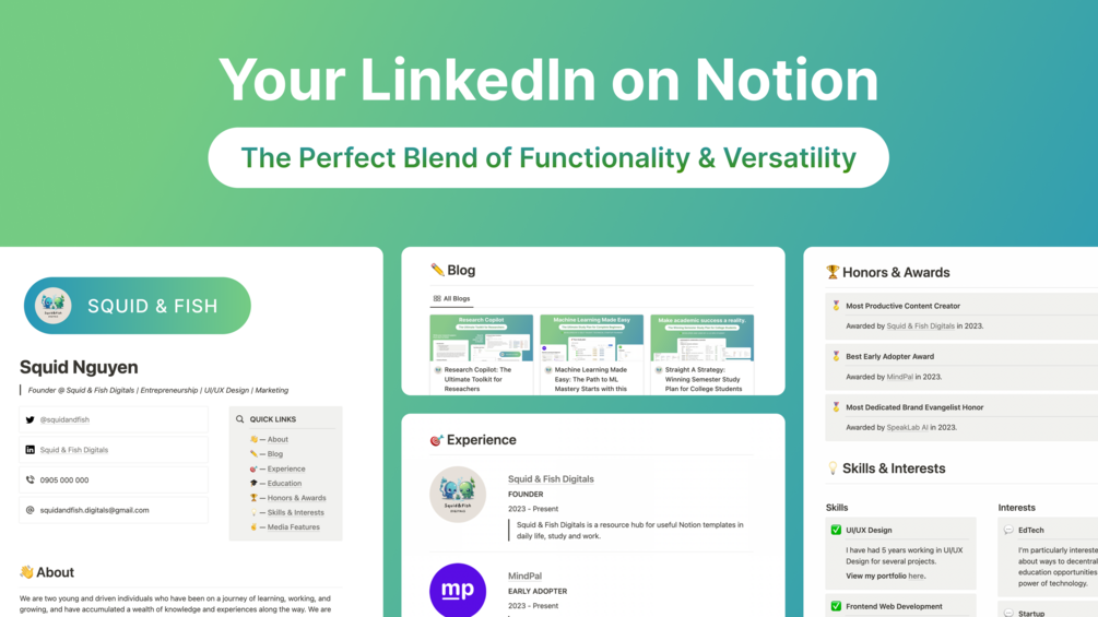 Introducing LinkedIn on Notion, a comprehensive personal profile platform that combines the functionality of LinkedIn with the versatility of Notion. With LinkedIn on Notion, you can showcase your professional achievements, skills, education, and interests in a beautifully designed and customizable format.
